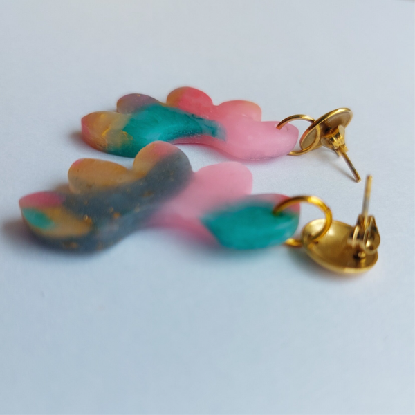 Een vrolijk gekleurde oorbel met een goudkleurig knopje. In de regenboog kleuren. Het achterkantje is ook ook goudkleurig metaal. Licht van gewicht!