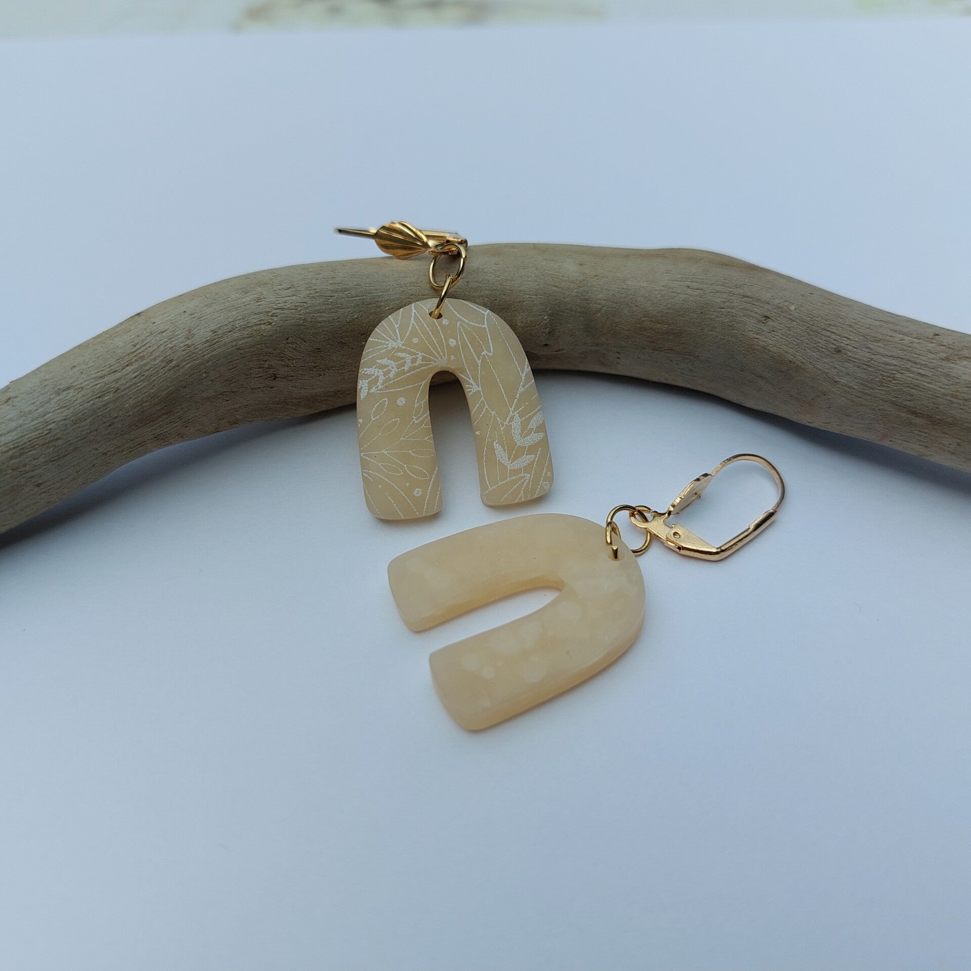 Een verfijnde hangoorbel. Beige van kleur met delicate natuur tekening. Afgewerkt met goudkleurige haakjes. Deze set is nikkelvrij!