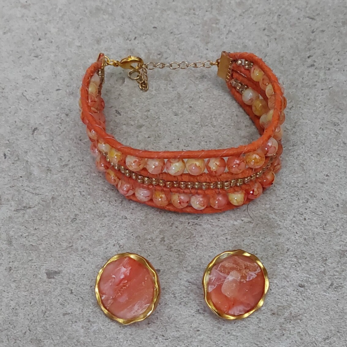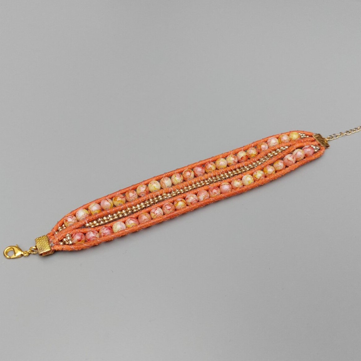 Een mooie, 3 rijen brede armband in de kleuren oranje-geel gecombineerd met goud. Een Bohemian armband van leer en kralen. Sluit af met een karabijnslotje en een kettinkje. In lengte verstelbaar. Er zijn speciaal voor deze armband bijpassende oorbellen gemaakt.