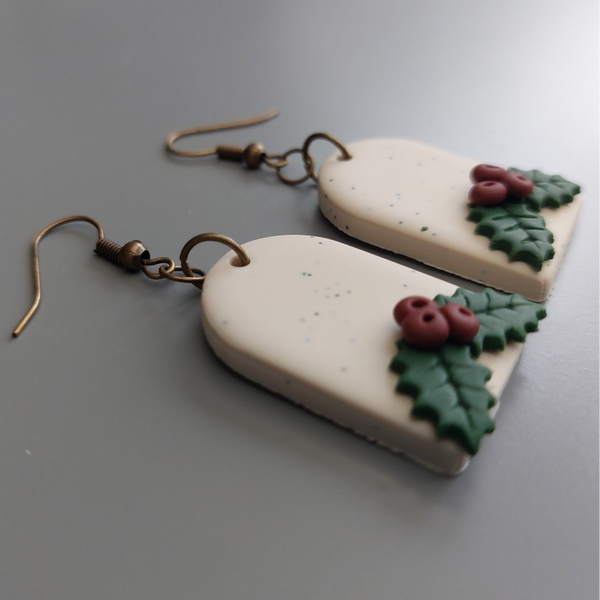 Kerstoorbellen in een off white kleur, met hulstblaadjes bekleed.