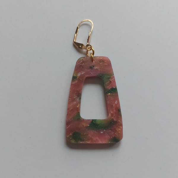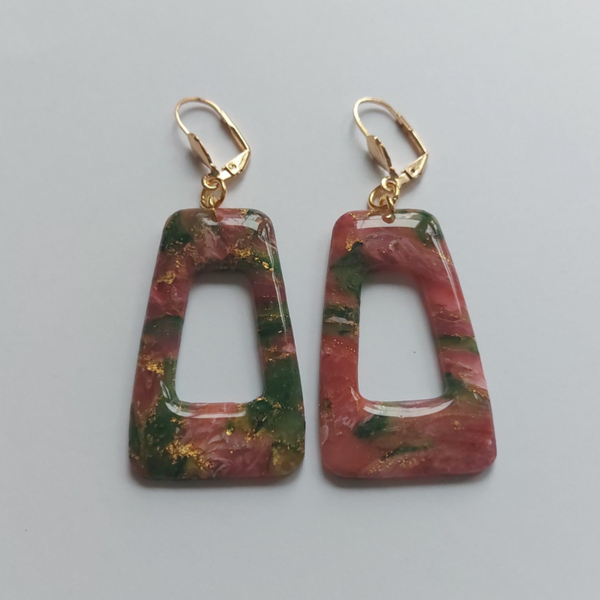 Modieuze hangoorbellen in trapezium vorm. In de kleuren groen, gemêleerd met rozerood en dooraderd met bladgoud.