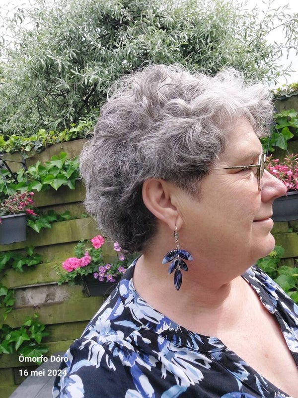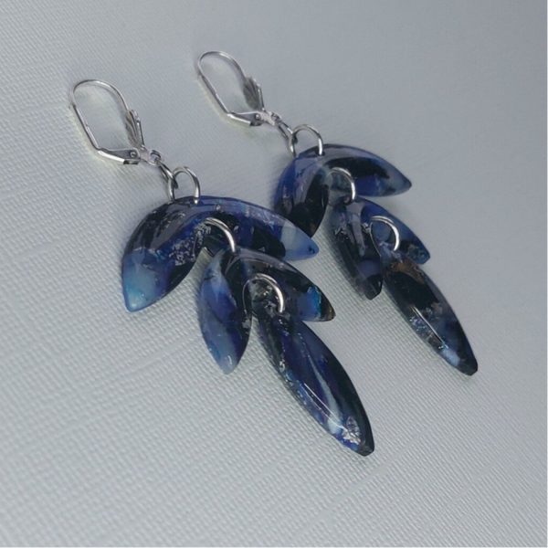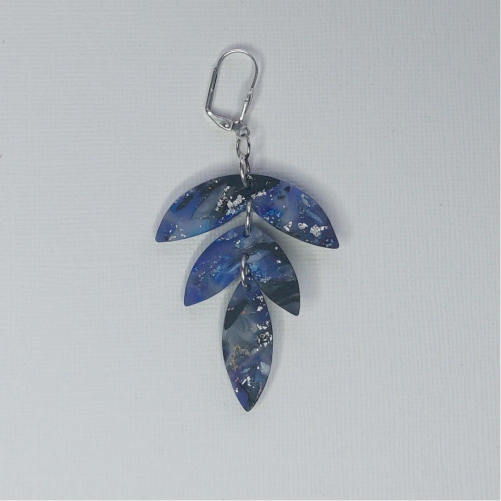 Een hang oorbel aan een nikkelvrij clipje, in een kleur melange van blauw, doorzichtig en zwart. Dooraderd met blad zilver.
