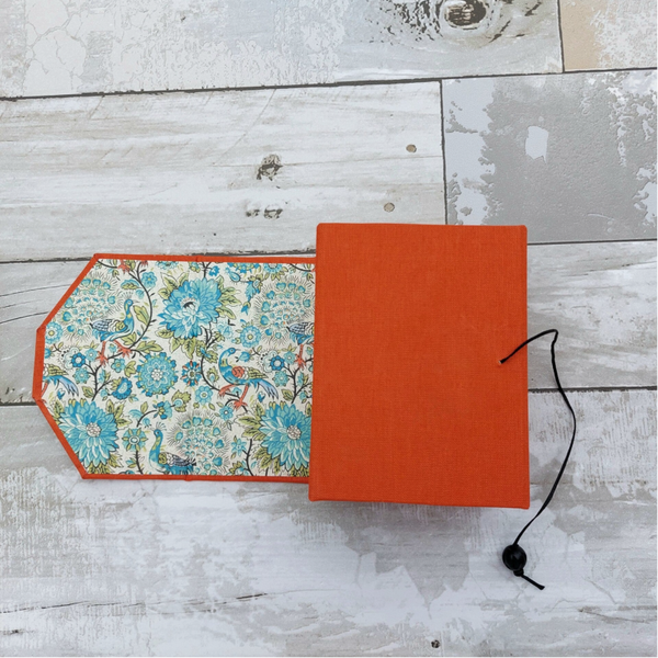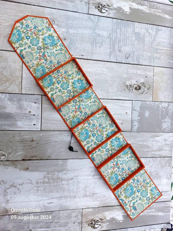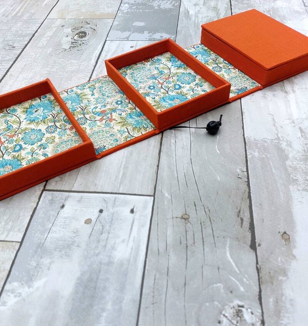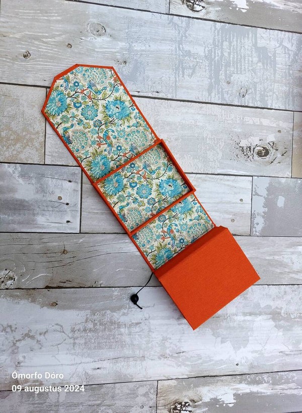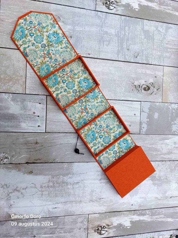 Dit sieraden reisdoosje is een praktisch en stijlvol accessoire voor onderweg. Het oprolbare doosje is gemaakt van stevig grijsbord, bekleed met boekbinderslinnen en Japans papier. De buitenzijde heeft een warme oranje kleur, terwijl de binnenzijde is afgewerkt met papier in groen-blauwe tinten, bedrukt met bloemen en pauwen.