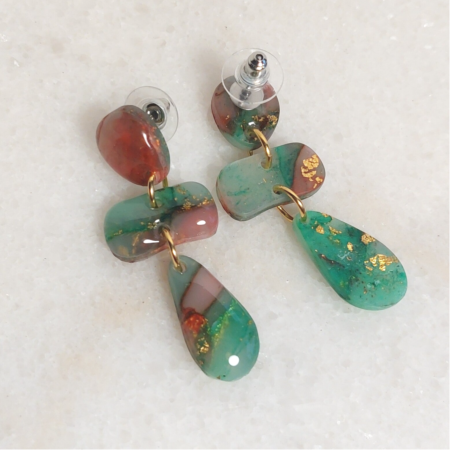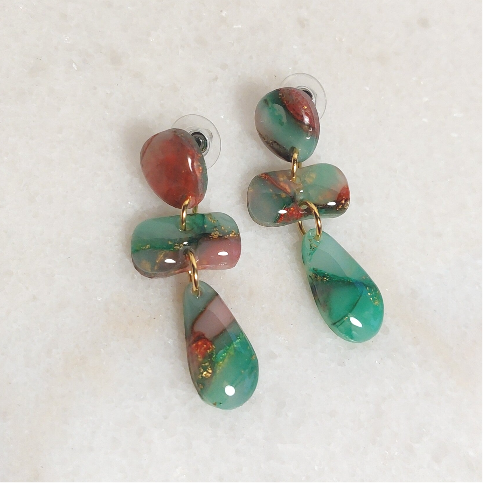 Een oorbel in een speelse combinatie van groen, rood en bladgoud. Lichtgewicht en ideaal om je outfit compleet te maken.