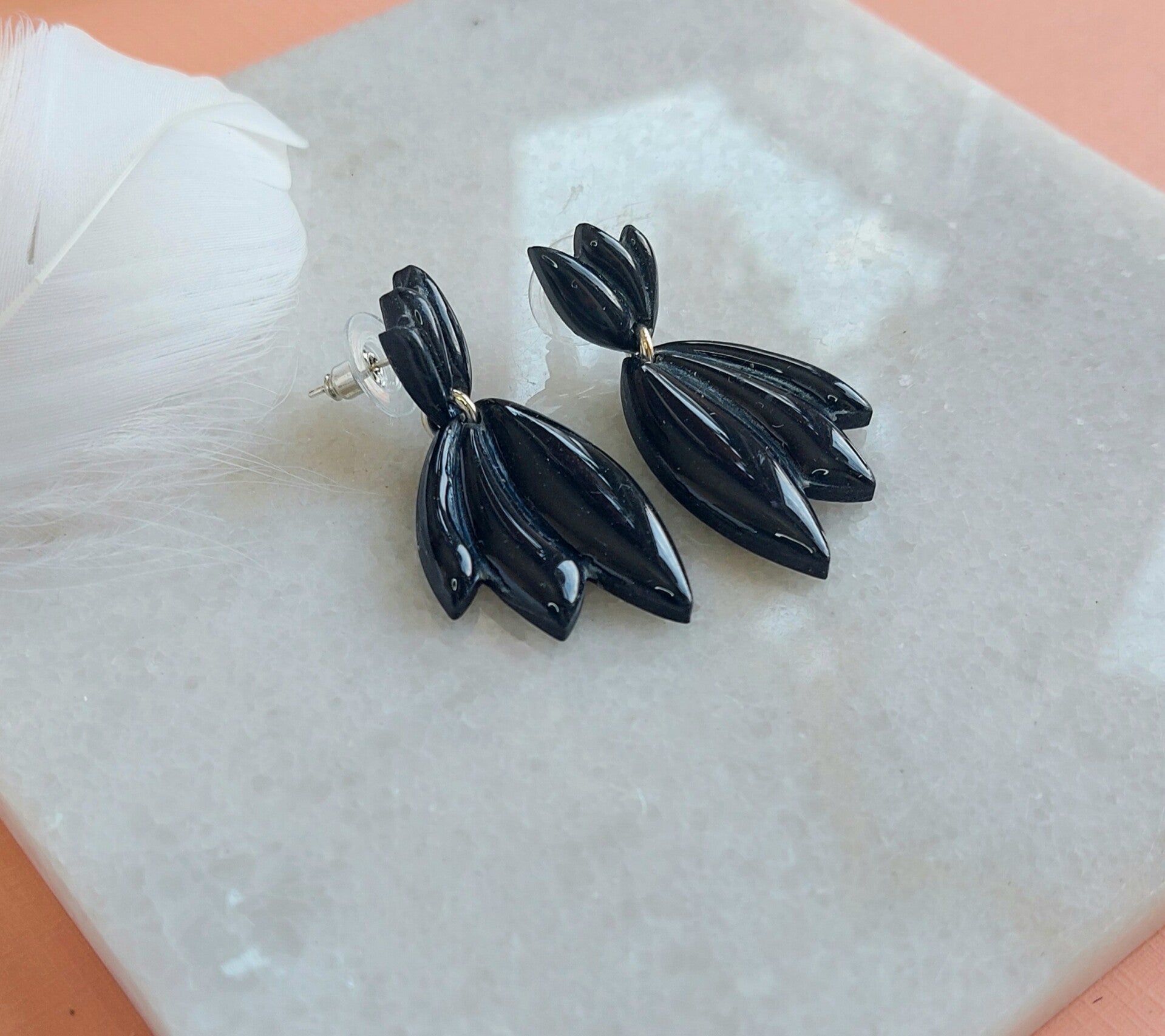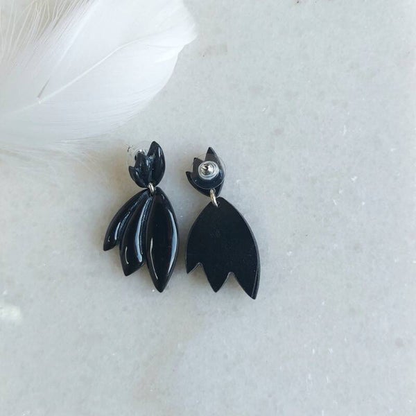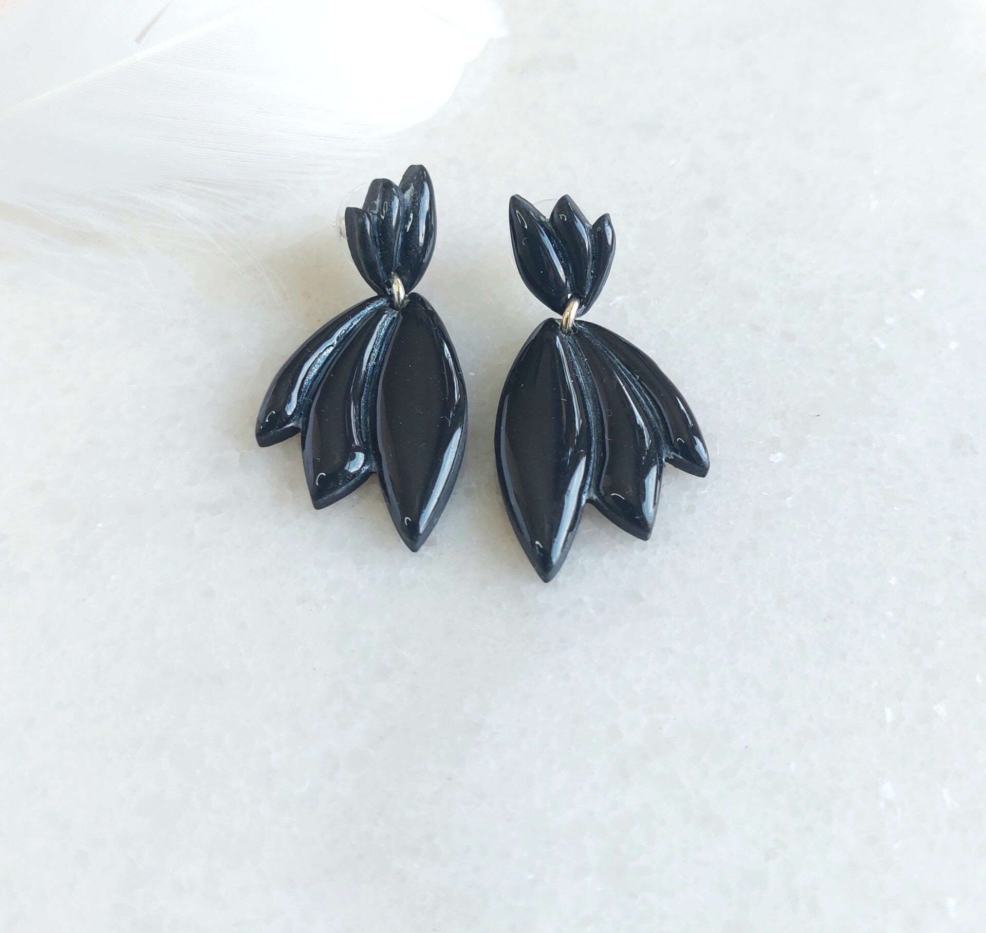 Een uniek ontwerp, in diep glimmend zwart, dat doet denken aan een tulp in bloei. Zacht van vorm, opvallend in uitstraling. Ze wiegen lichtjes mee en geven een elegante touch aan je look.