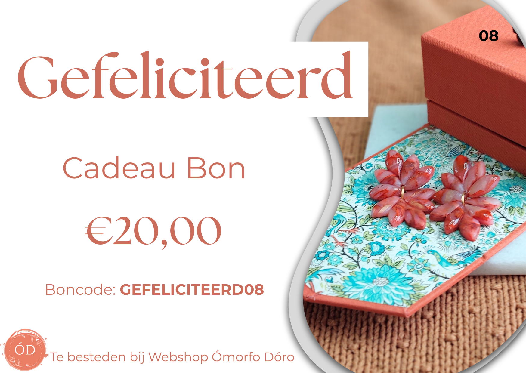 Met deze bon kan de ontvanger zelf iets moois uitzoeken uit onze webshop – van handgemaakte oorbellen en armbanden tot sieradendoosjes. Er hoeft alleen de Boncode ingevuld te worden!