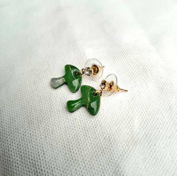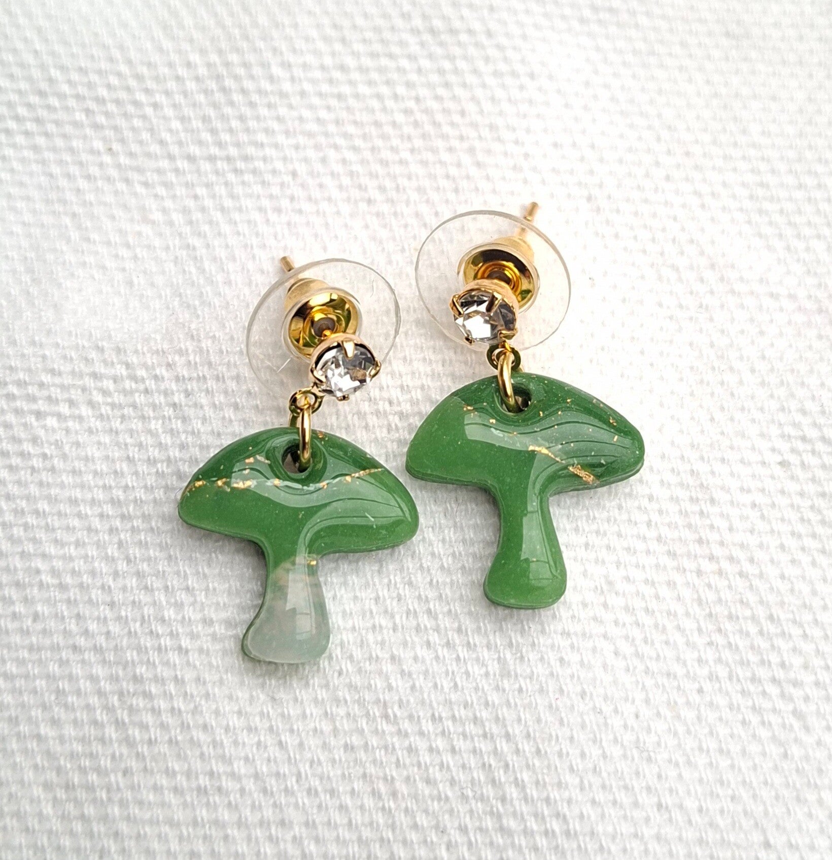 Een knipoog naar het bos: mosgroene, kleine paddenstoeltjes bungelen onder een fonkelend steentje. Leuk voor een moeder-dochter combinatie. De grotere paddenstoeltjes zijn hieronder te vinden.