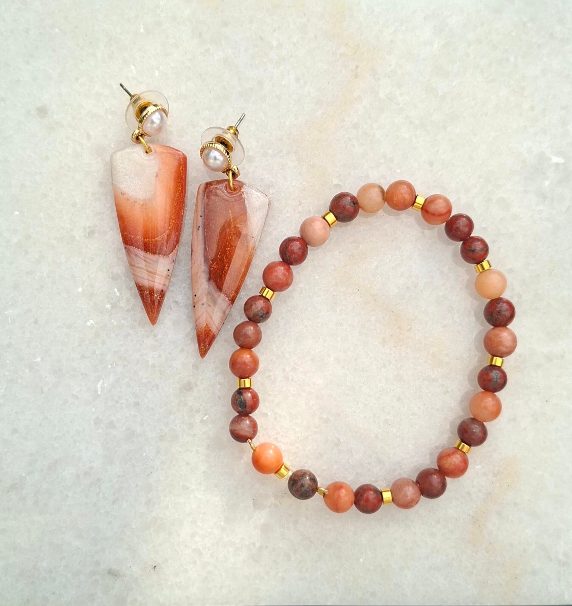 Een oorbel met een knipoog naar contrast: een strak gevormd design met daarboven een klassieke parelknop. De marmering van roest en parelmoer maakt ‘m warm en chic, terwijl het bladgoud een vleugje luxe toevoegt. Een balans tussen strak en zacht – en dat maakt ‘m verrassend veelzijdig.