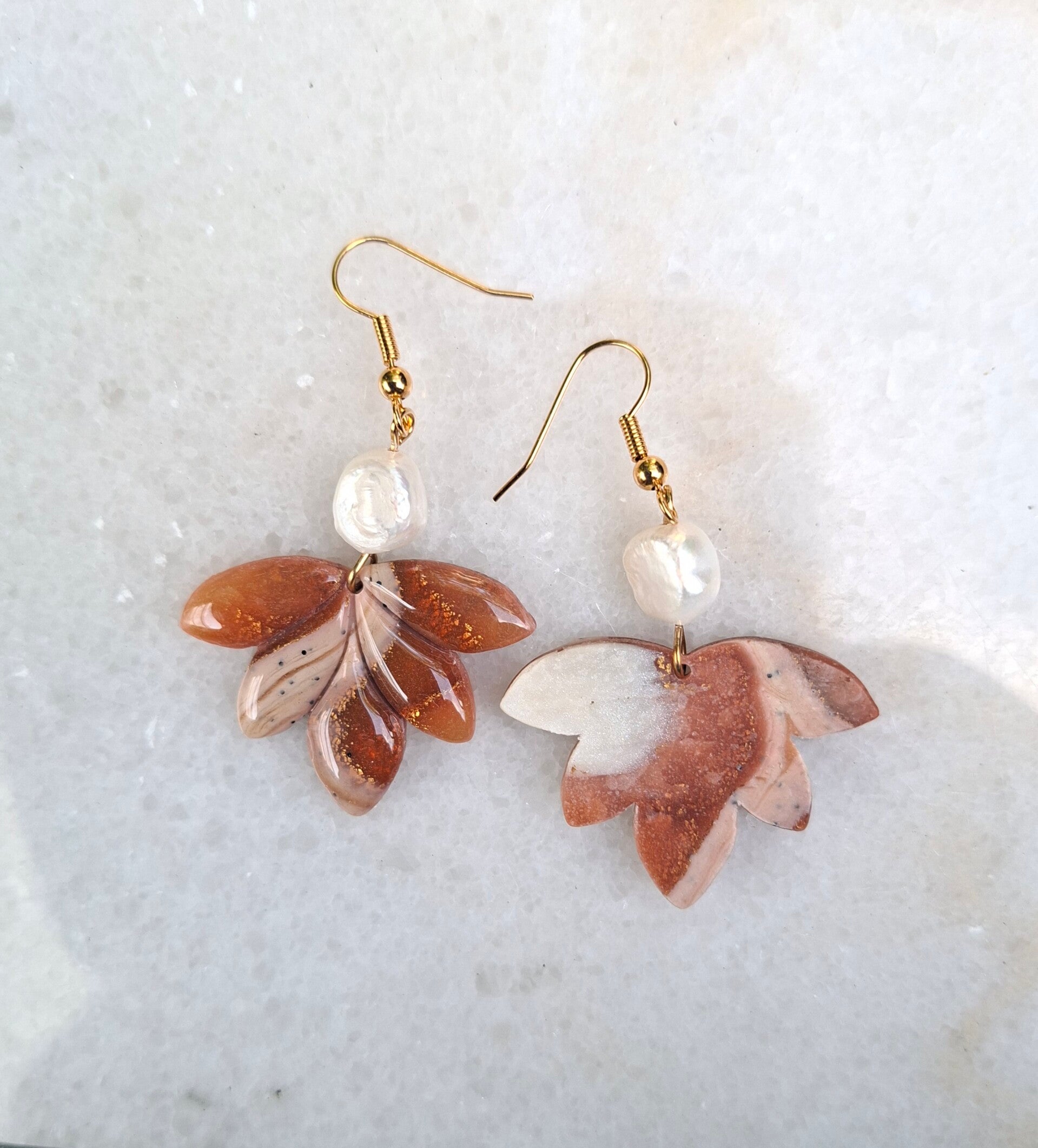 Bloemen, maar dan net even anders. Deze oorbel laat een ontluikende bloem zien, gemarmerd in roest en parelmoer en afgewerkt met een zachte parelkraal. Elegant zonder te zoet te worden, en dus makkelijk te combineren. Een ode aan de natuur, maar met een stoere rand.
