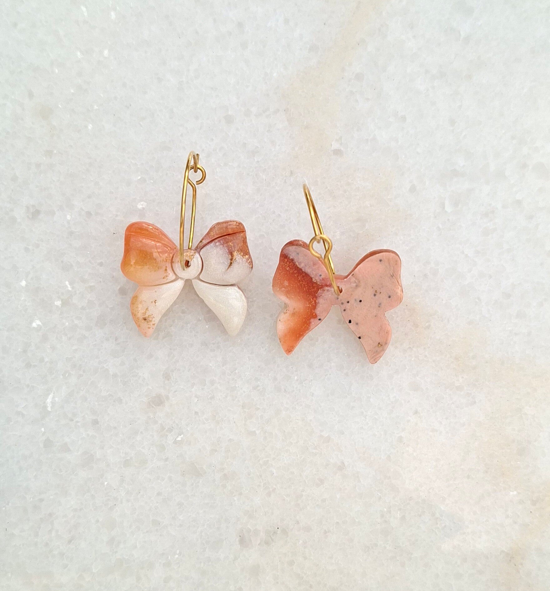 Een creool die vrolijk wordt aangekleed met een klein strikje. De warme marmering van roest, parelmoer en goud maakt het sierlijk en tijdloos. Het perfecte speelse detail voor dagen dat je nét wat extra’s wil.