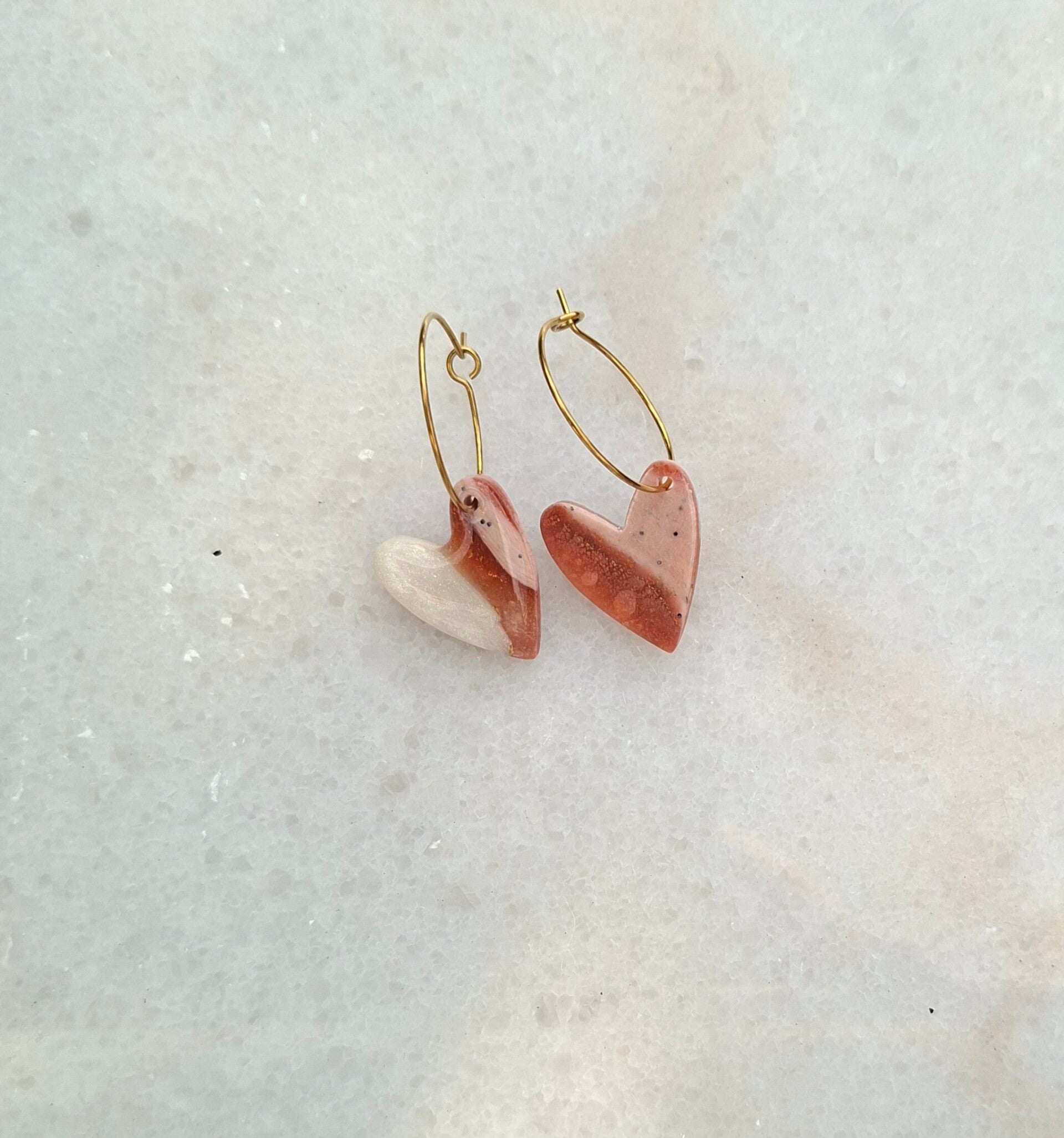 Een speels ontwerp met kleine hartjes aan creolen. Gemarmerd in roest en parelmoer, met bladgoud voor de glans. Klein van stuk, groot in betekenis. Voor wie graag liefde mee de wereld in neemt – maar zonder kitsch.