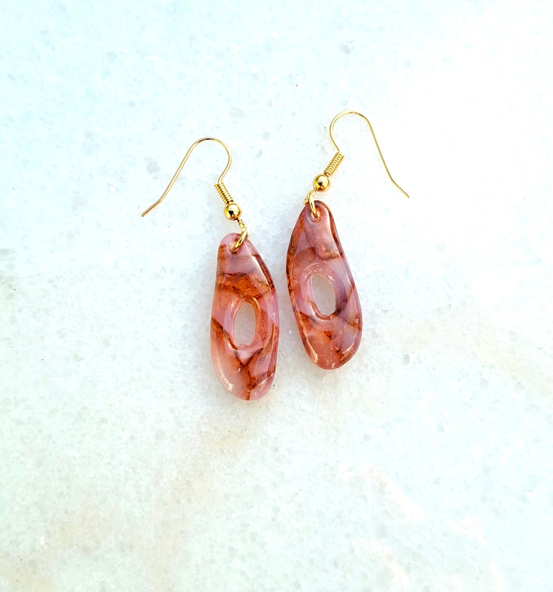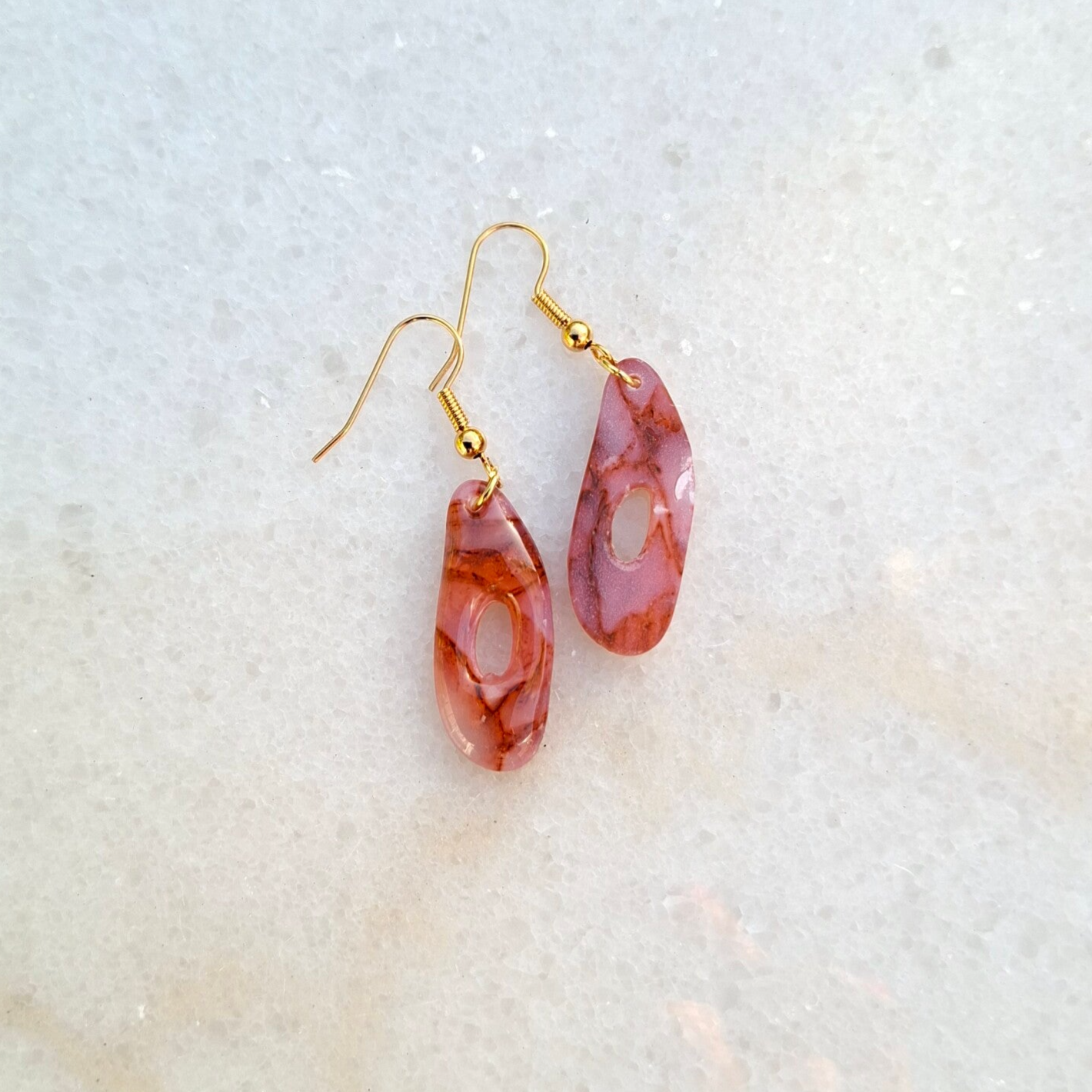 Minimalistisch, modern en tijdloos. De langwerpige ovale vorm met open midden is opvallend in zijn eenvoud, en de warme steenrode marmerlook maakt het geheel uniek. Een oorbel die je overal bij kunt dragen.