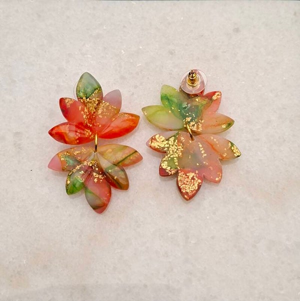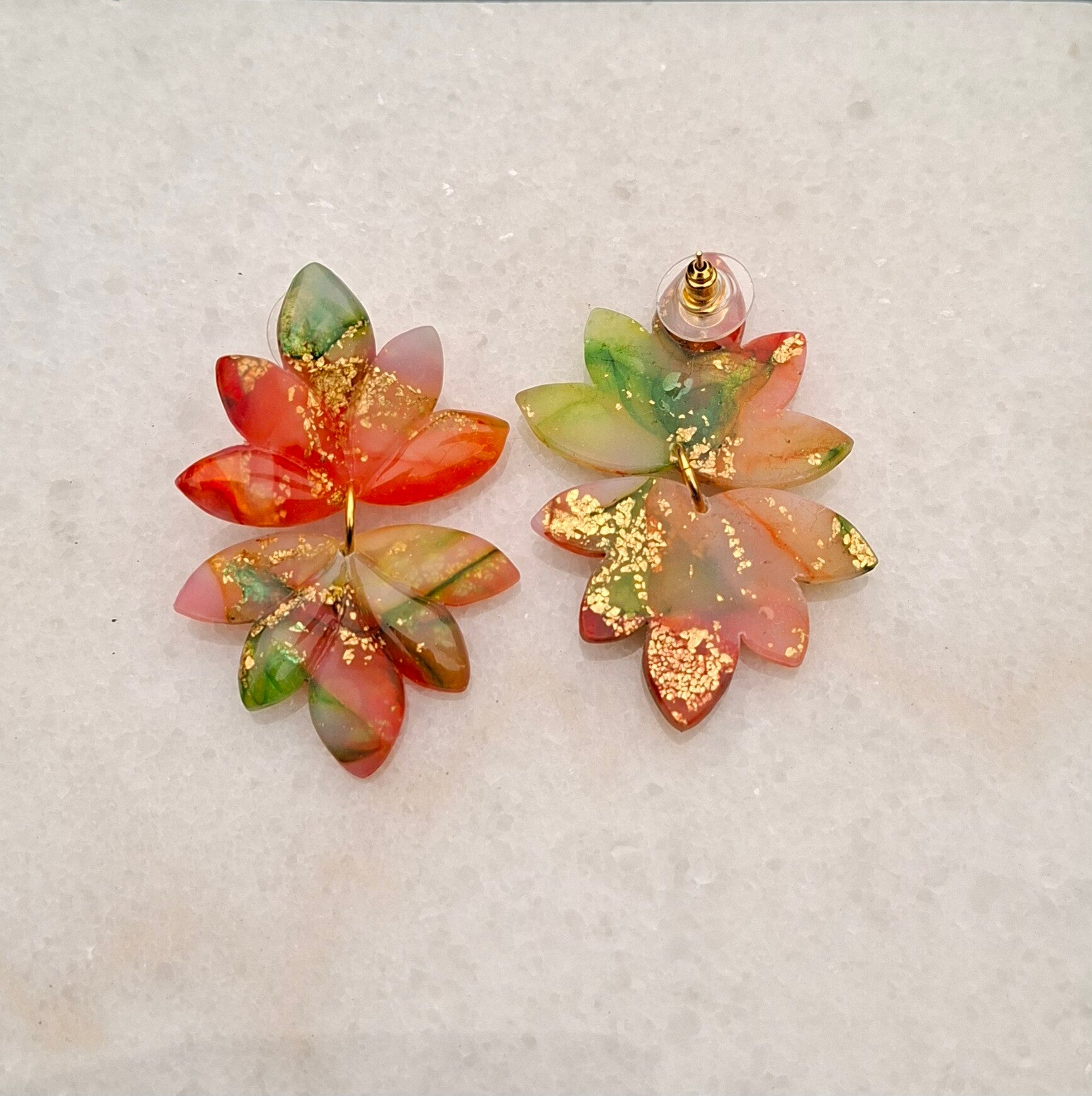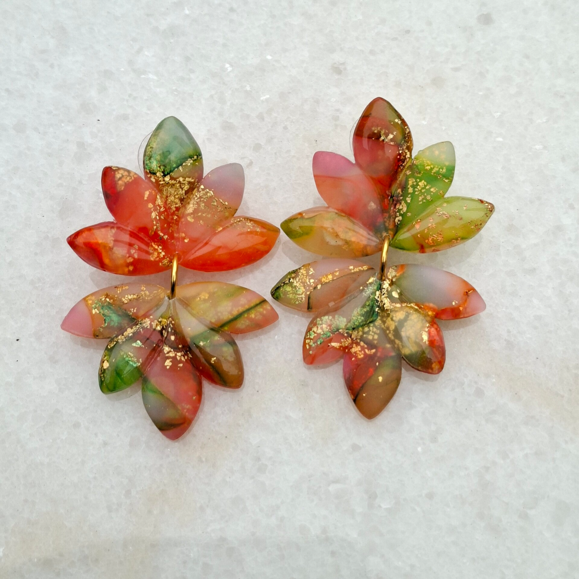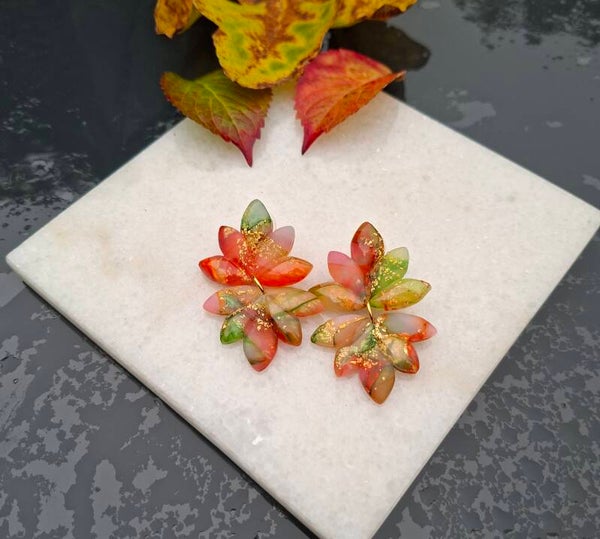Deze Signature oorbellen zijn pure herfstmagie. Met hun opvallende formaat en de rijke combinatie van diep oranje en mosgroene tinten, gemarmerd met luxueus bladgoud, zijn het echte eye-catchers. Omdat ze gemaakt zijn van polymeerklei, zijn deze grote schoonheden verrassend licht van gewicht. Je maakt dus een krachtig statement zonder dat je oren zwaar belast worden. De oorbellen zijn bevestigd aan hypoallergene onderdelen, ideaal voor wie snel reageert.