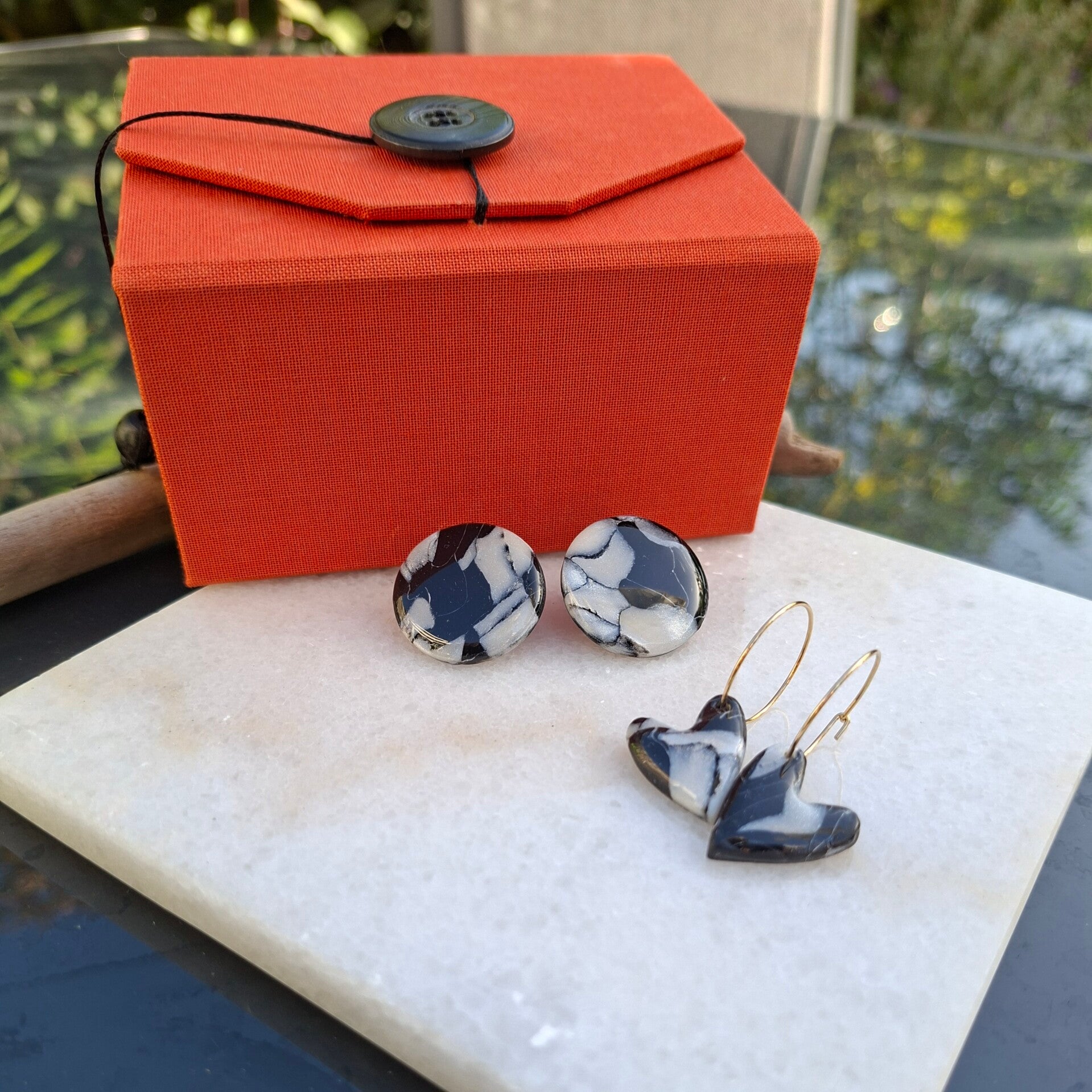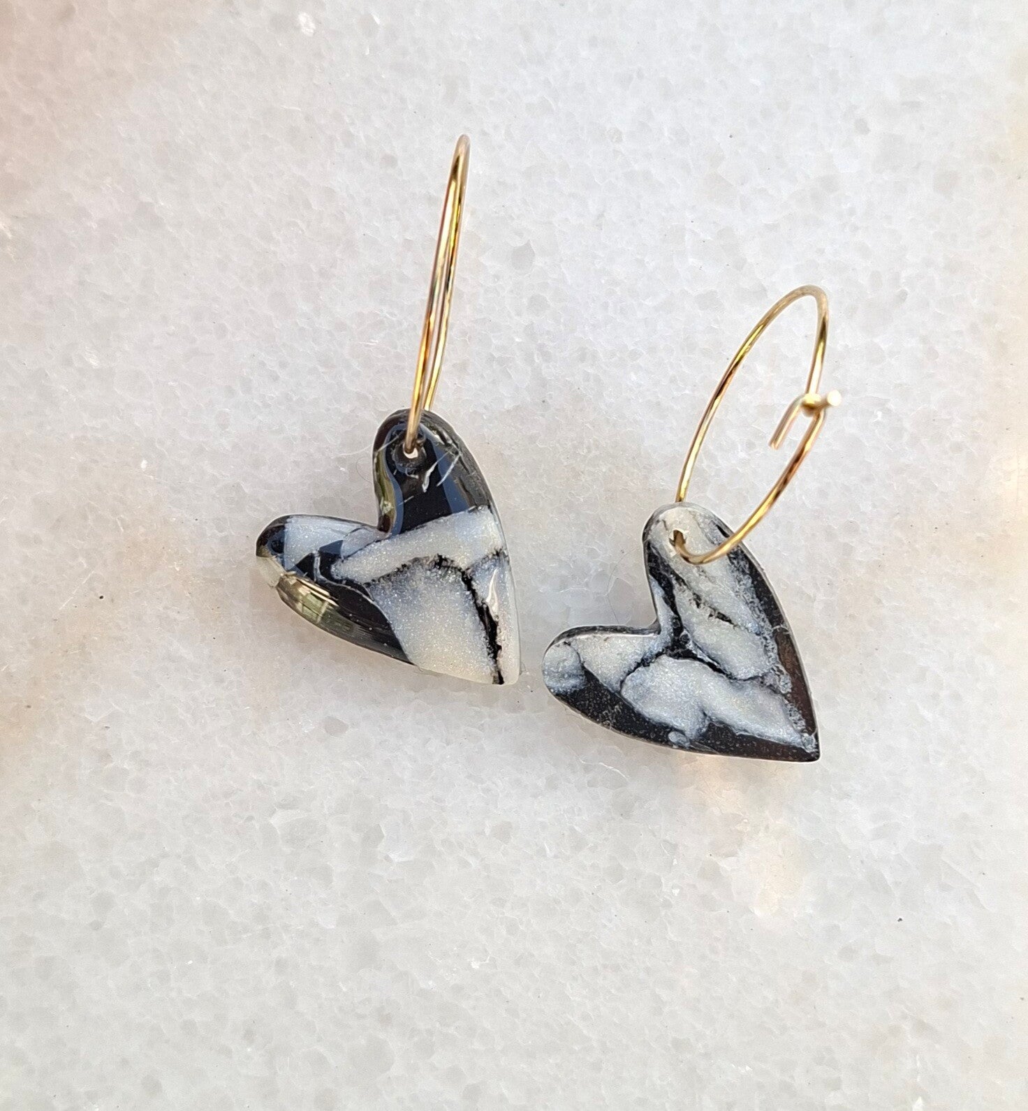Zwart en parelmoer wit in hartvorm: onze meest verkochte vorm. De creool geeft een glimtje goud en dat is precies genoeg. Speels en chic tegelijk.