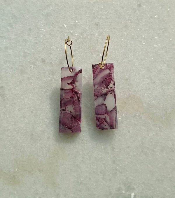 Een langwerpig staafje in lila gemarmerd, hangend aan een goudkleurige creool. Een vlotte en moderne uitstraling.