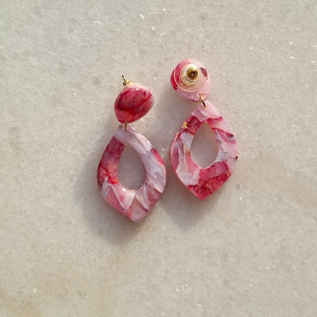 Een knopje met een druppel eronder in gemarmerd wit, roze en rood. De druppel heeft een open midden, wat speelsheid geeft aan het ontwerp.