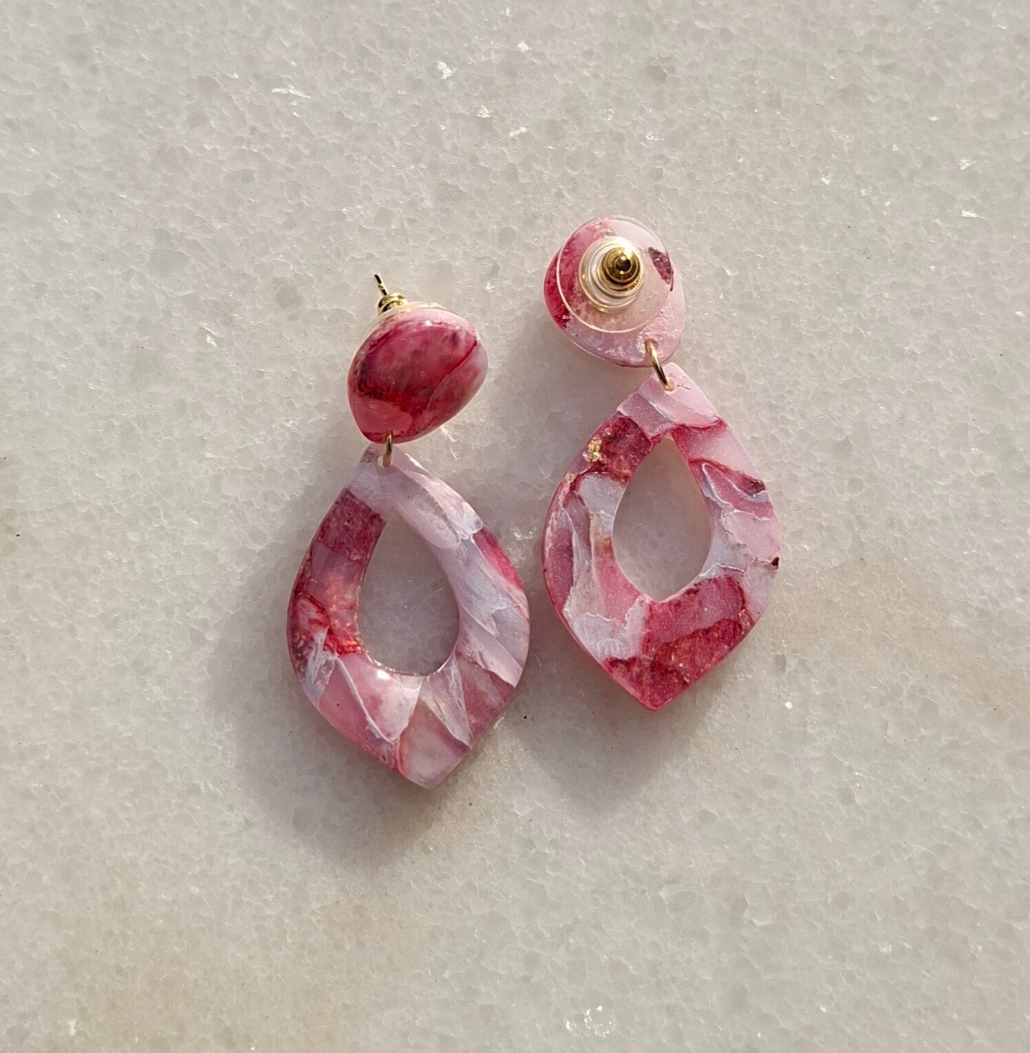Medium knopje met een druppelvormige hanger in roze, wit en bordeaux marmering.