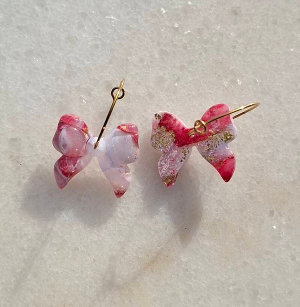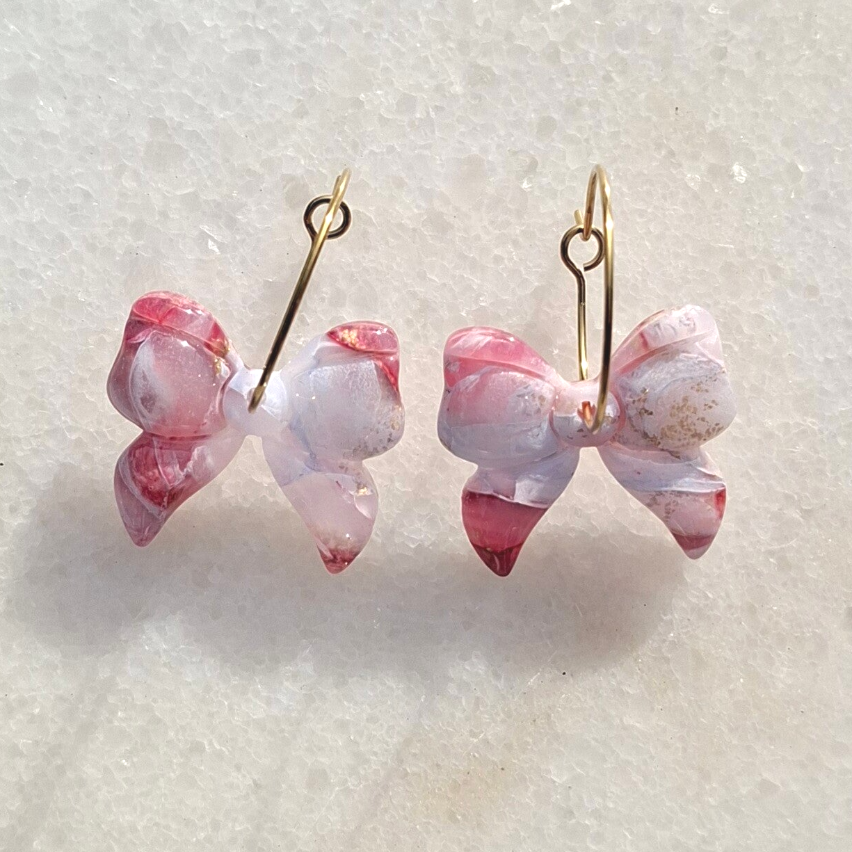 Strikjes in wit, roze en bordeaux, bevestigd aan een kleine vergulde creool.