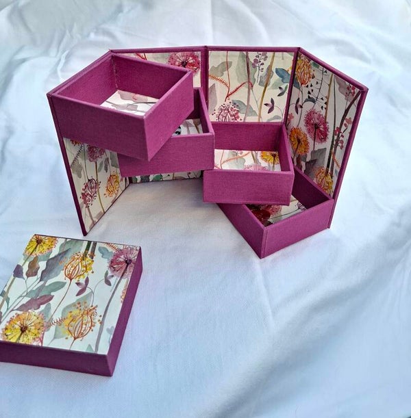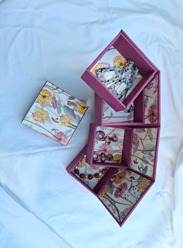 Elk doosje wordt met de hand gemaakt, met gekozen kleuren en papier. Zo krijg je geen standaard oplossing, maar een handgemaakte sieradendoos die past bij jouw stijl of bij de persoon aan wie je het geeft. Perfect als luxe sieradendoos cadeau voor een oorbellenliefhebber.