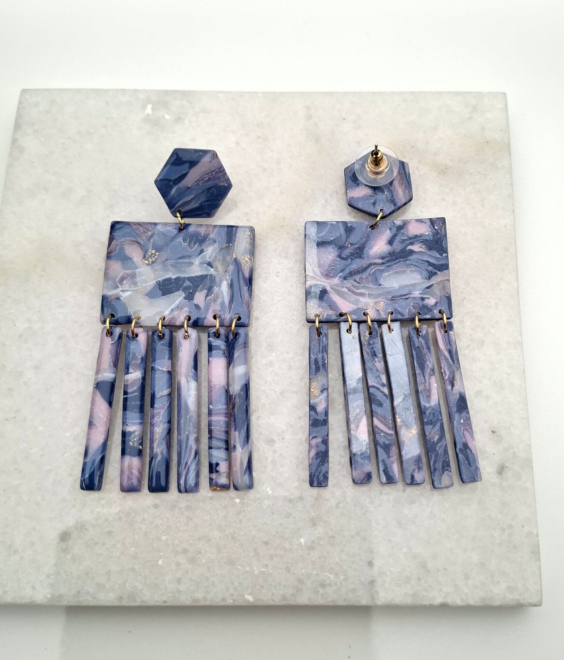 Een hexagon-stekertje met daaronder een rechthoek op zijn kant, afgewerkt met zes bungelende staafjes. Alles in dezelfde gemarmerde stijl van nachtblauw, roze en bladgoud.