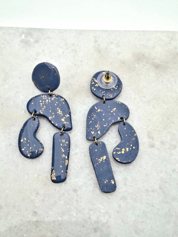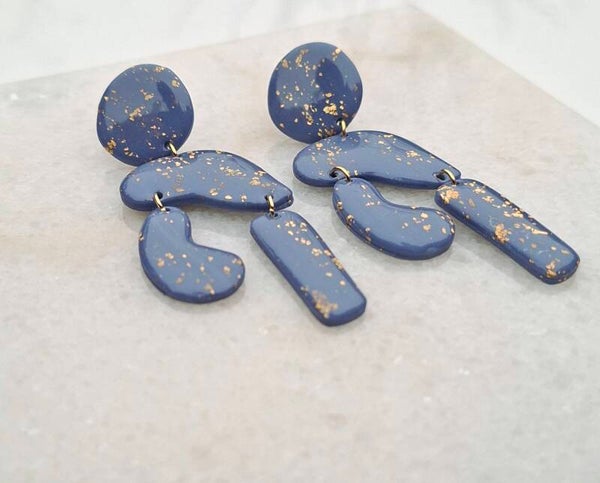 Deze grote oorbellen in diep nachtblauw zijn allesbehalve standaard. De aparte vormen en subtiele bladgoud glitters geven ze een mysterieus, krachtig karakter.