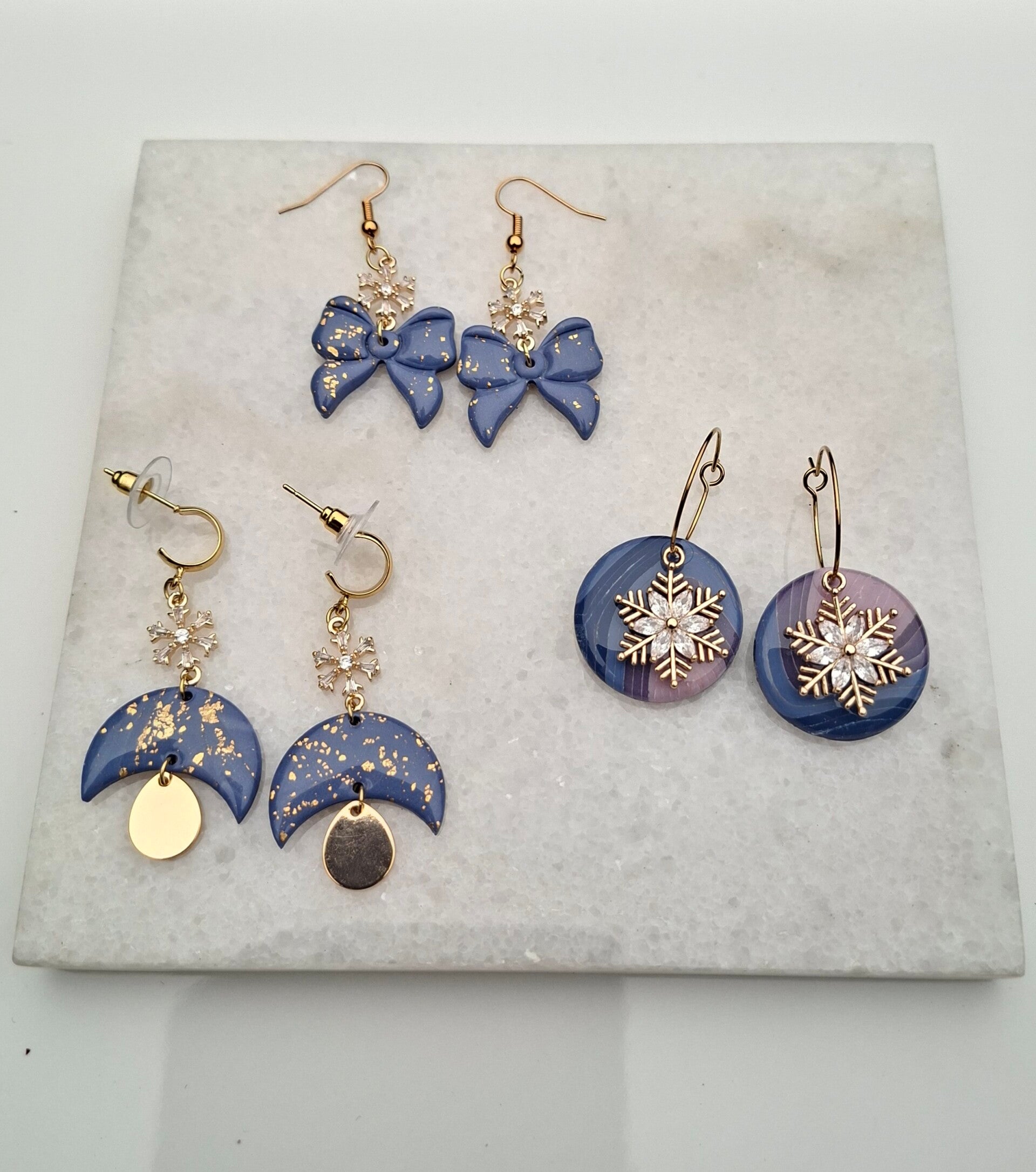 Deze oorbellen hebben een halve maan die dwars geplaatst is, met daaronder een goudkleurig druppeltje en erboven een subtiel strasssterretje. De oorbellen hangen aan een open ringetje dat op een stekertje zit.