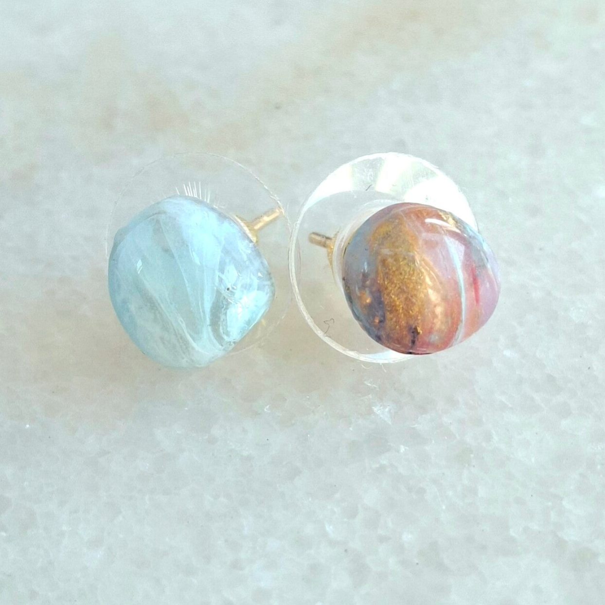 Soms is minder écht meer. Deze mini knopjes lossen het probleem op van zware metalen oorbellen die je huid irriteren. Met de Faux Gem techniek krijgt elk knopje een eigen patroon van blauw en goud. Je voelt je verzorgd en authentiek, de hele dag door. Zo licht dat je ze vergeet – tot de complimenten komen.