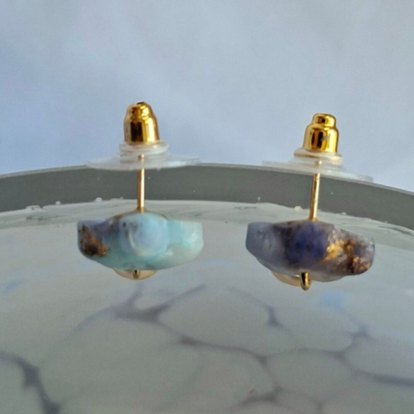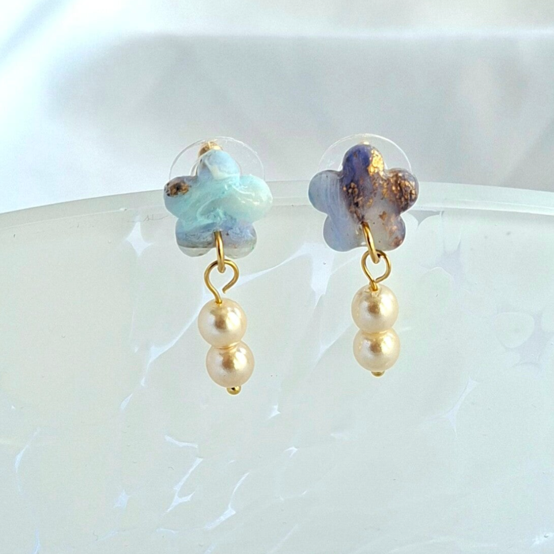 Deze leuke kleine blauw gemêleerde bloemetjes worden extra chique met de pareltjes die er onder hangen. Alicia heeftde Faux Gem techniek gebruikt bij het maken van deze serie, wat er voor zorgt dat de edelsteen-gelijkende knopjes niets wegen. Fijn voor je oren. Je vergeet dat je ze in hebt, maar je krijgt wel complimenten.
