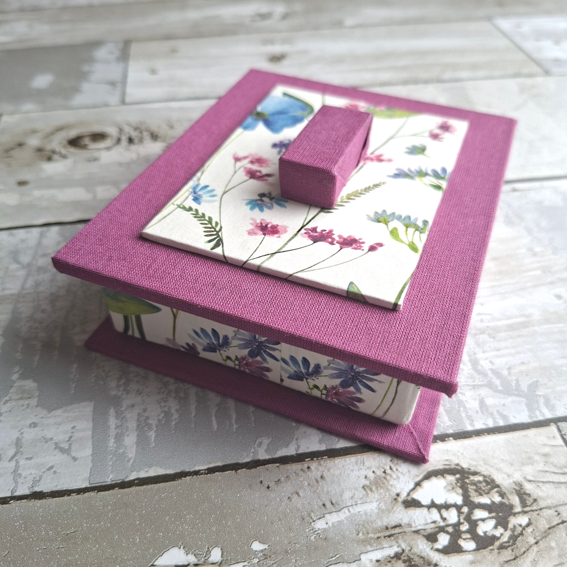 Materiaal: Handgemaakt met de cartonnage techniek van grijsbord, boekbinderslinnen en stevig cartonnage papier