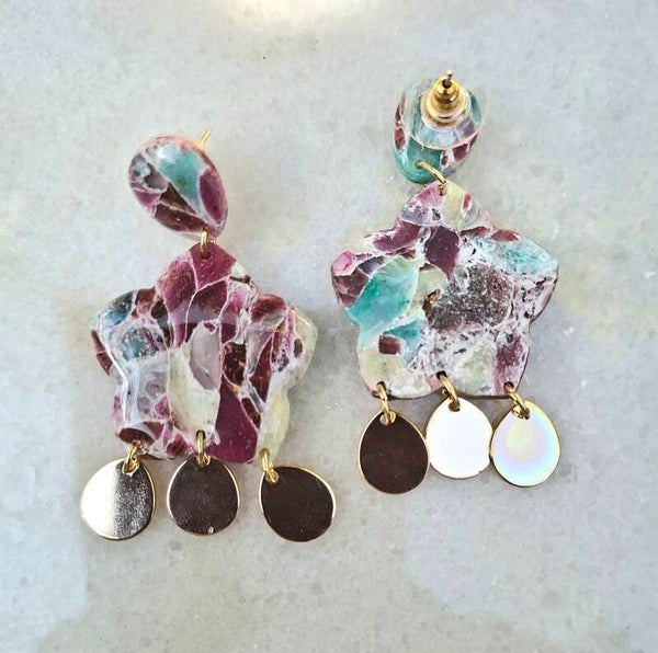 Grote oorbellen ogen vaak prachtig in de spiegel, maar de realiteit is dat ze vaak aan je oorlellen trekken of irritatie veroorzaken. Dat is voorbij met dit ontwerp. Deze oorbellen combineren een bloemvorm met goud doublé druppels voor een verfijnde balans. Dankzij Alicia's werkwijze met polymeerklei, blijft het sieraad lichtgewicht en vormt het geen belasting voor je oren. Je draagt een sieraad dat opvalt en dat je met zelfvertrouwen de hele dag draagt, of je nu op je werk bent of een afspraak hebt.