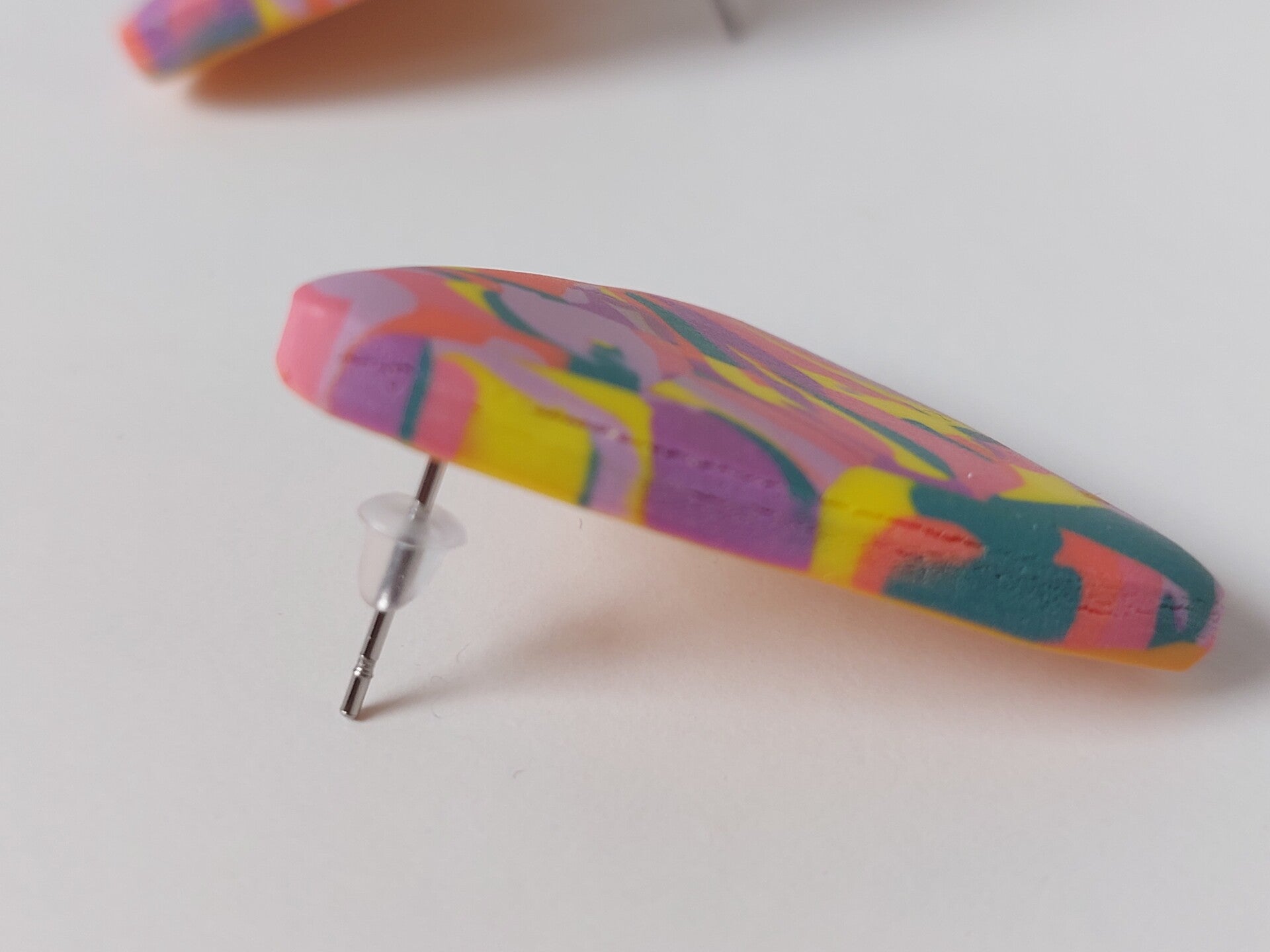 Een oorbel uit de Set-Serie in vrolijke zomerse kleuren lila, groen, geel en oranje